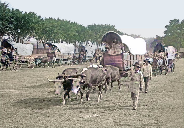 “The wagons, after receiving their loads, separately return to the camping places until all belonging to the train are assembled. At that, the order of march is given. A scene then ensues that baffles description. Carriages, wagons, men, horses, mules, and oxen appear in chaotic confusion. Men are cursing, distressing mulish outcries, bovine lowing, form an all but harmonious concert, above the dissonances of which the commanding tone of the wagon master’s voice only is heard. The teamsters make merciless use of their whips, fists, and feet. The horses rear, the mules kick, the oxen baulk. But gradually order is made to prevail, and each of the conflicting elements assumes its proper place. The commander finally gives the sign of readiness by mounting his mule, and soon the caravan is pursuing its slow way along the road.