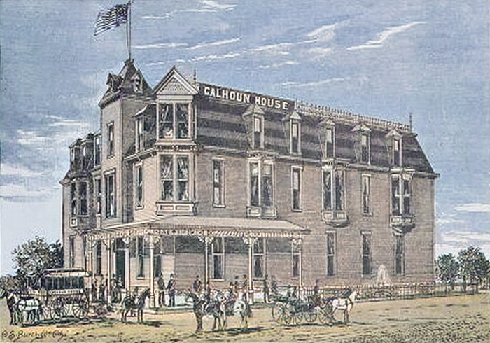 At about that time, the Calhoun Hotel was built and furnished by Ross Calhoun at a cost of $16,000. The handsome hotel was a beautiful specimen\, whose fine style, superior finish, and elegant furnishings were a splendid compliment to the builder and the city. It is admirably planned, and perfectly heated by a superior hot-air heating plant; it has not a single dark or dingy corner, and from the base to the attic was aglow with light and warmth. The ample office and dining room, elegantly furnished parlors and sleeping rooms, spacious and airy halls and corridors, fine table service and delightful cuisine, gave the new hostelry great favor with the citizens and traveling public. The Calhoun had waterworks of its own, bringing the clear waters of Sunset Lake to every portion of the house and grounds, which looked out upon a pretty park, whose well-shaded walks and drives.