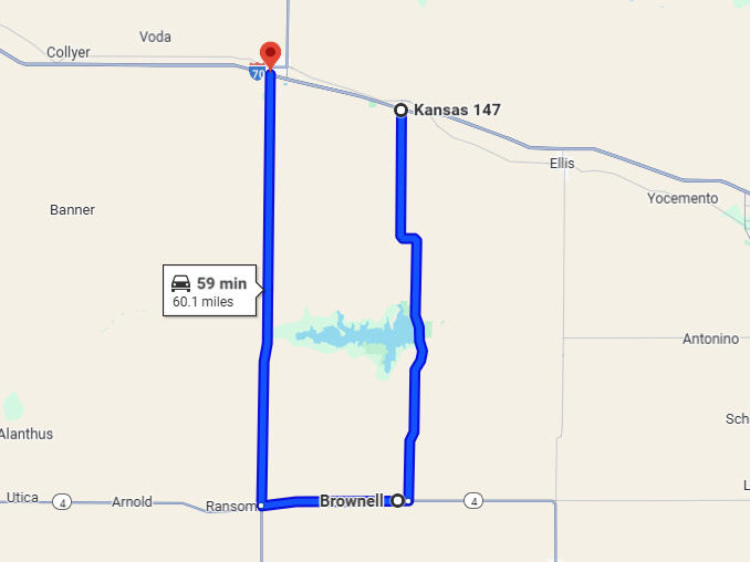 From Ogallah, Kansas, head south on KS-147 South toward K Rd for 24.9 miles; Turn right onto KS-4 West Smoky Valley Scenic Byway for .6 miles; Turn right onto 5th Street to Brownell; then head south on 5th Street toward Davis Ave Smoky Valley Scenic Byway. Turn right at the first cross street onto KS-4 W Smoky Valley Scenic Byway and continue to follow KS-4 West for 8.3 miles, then turn right onto US-283 North for 26.2 miles to WaKeeney, Kansas.