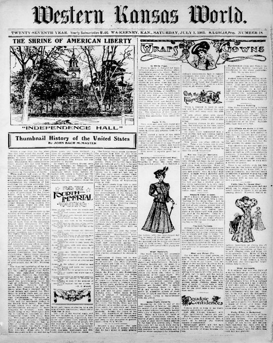 The first newspaper, the WaKeeney World, was first issued on March 8, 1879, under the proprietorship of W.S. Tilton. It started as a six-column paper, but in August 1879, it was enlarged to seven columns.